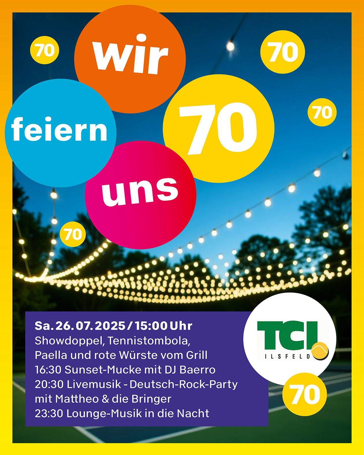 Am 26.Juli 2025 wollen wir auf unserer Tennisanlage ein rauschendes Fest in der bewährten TCI-Qualität feiern und unseren Verein hochleben lassen.